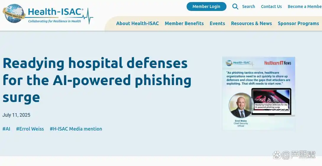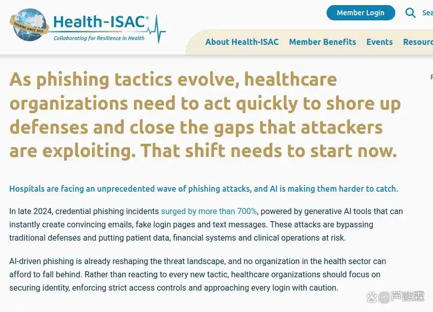 钓鱼攻击作为社会工程学中最常见的攻击形式,长期以来是数据泄露事件的主要诱因之一。根据Verizon《2024年数据泄露调查报告》,医疗行业约35%的安全事件涉及钓鱼手段。然而,随着生成式AI(如大型语言模型LLM)的普及,攻击者能够以极低成本批量生成语义自然、上下文连贯、甚至包含机构内部术语的钓鱼内容,极大提升了欺骗成功率。Health-ISAC于2025年7月发布的报告指出,2024年第四季度,针对美国医疗机构的凭证钓鱼攻击同比增长超过700%,且攻击周期显著缩短,部分攻击在数小时内即可完成从初始接触至凭证窃取的全过程。
