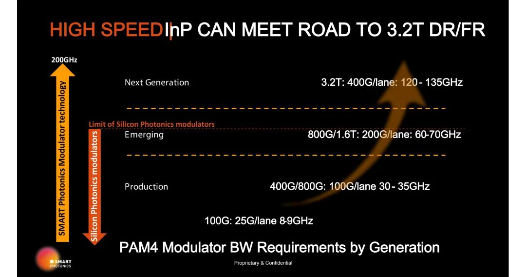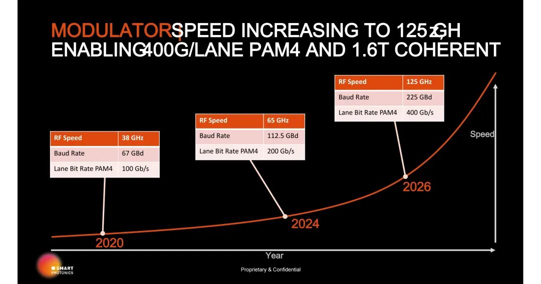 调制器作为InP PIC的核心器件,其性能迭代直接推动传输速率升级。SMART Photonics的调制器技术呈现清晰的演进路径:2020年实现38GHz射频速度、67GBd波特率,支持100Gb/s lane PAM4传输;2024年升级至65GHz射频速度、112.5GBd波特率, lane速率提升至200Gb/s PAM4;2026年将突破125GHz射频速度、225GBd波特率,实现400Gb/s lane PAM4传输,超高的125GHz带宽也为1.6T相干通信奠定基础。