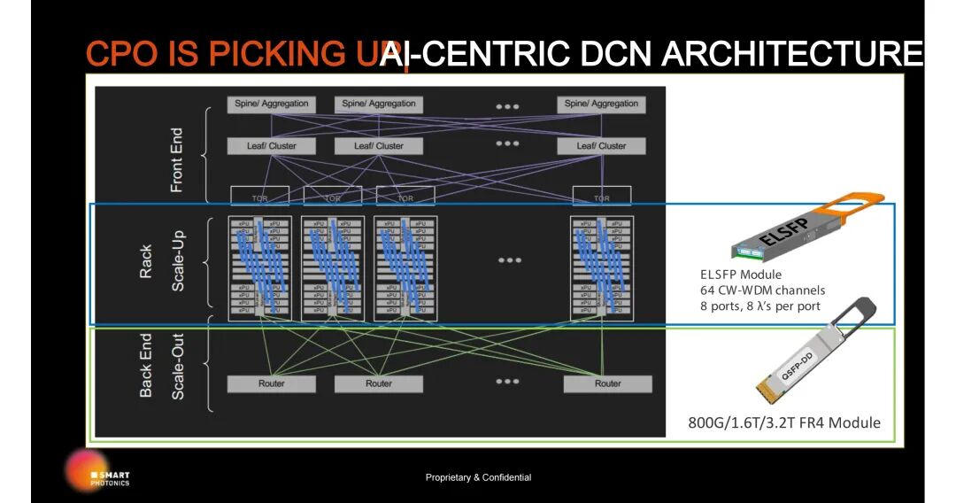 AI数据中心网络(DCN)架构正推动传输速率向800G/1.6T/3.2T演进,SMART Photonics的InP PIC方案完美适配这一趋势。该架构包含 spine/聚合层、leaf/集群层、TOR(机架顶部)交换机等层级,终端采用64通道CW-WDM ELSFP模块(每端口8个波长)与8端口800G/1.6T/3.2T FR4模块,通过InP PIC的高集成特性实现海量数据的高速传输,为CPO技术的规模化应用提供核心支撑。