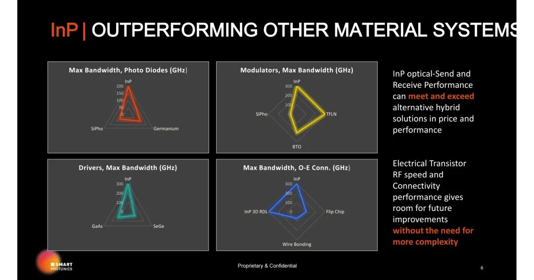 1. 极致高速性能:光电二极管、调制器、驱动芯片的最大带宽分别可达200GHz、300GHz、300GHz,光电综合带宽达100GHz,远超硅光子(SiPho)、锗(Germanium)、砷化镓(GaAs)等材料;