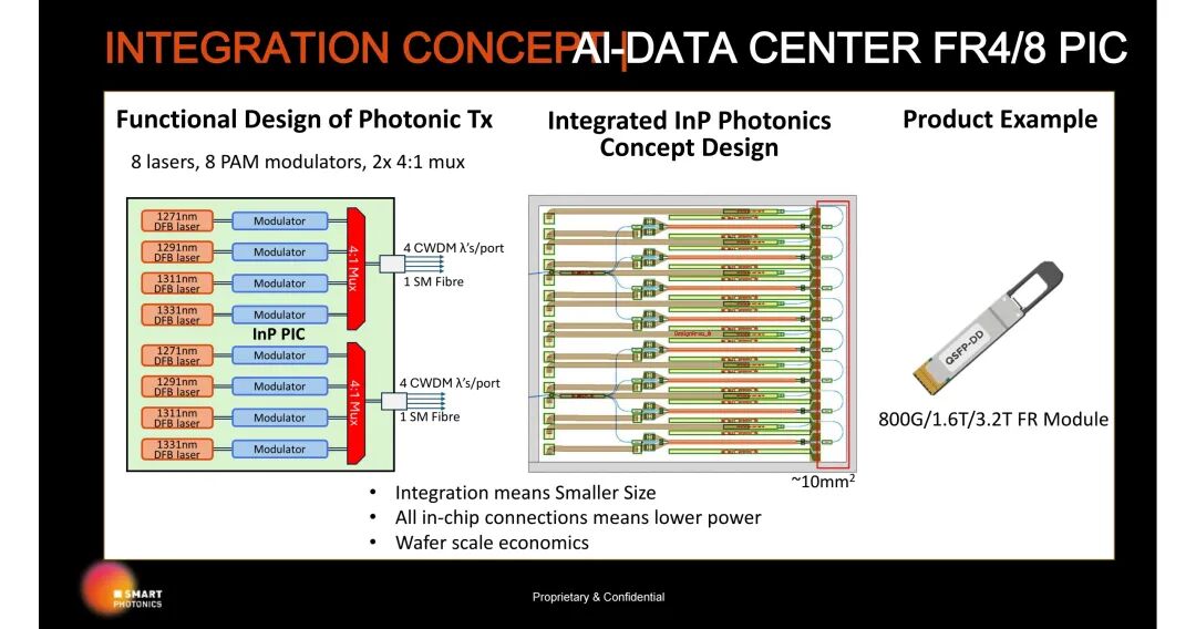SMART Photonics提出的AI数据中心FR4/8 PIC集成概念,展现了InP技术的小型化与高集成优势。以光子发射端(Tx)功能设计为例,单颗InP PIC集成了8个激光器、8个PAM调制器及2个4:1多路复用器,涵盖多波长通道,实际尺寸仅约10mm²。这种高度集成带来三大核心价值:一是芯片内连接减少光学损耗,降低系统功耗;二是极小尺寸适配高密度封装需求;三是晶圆级制造实现规模化经济效益。