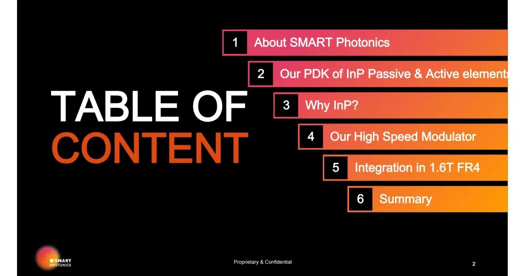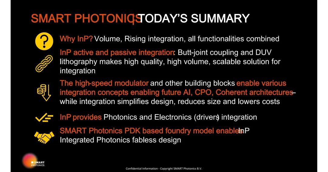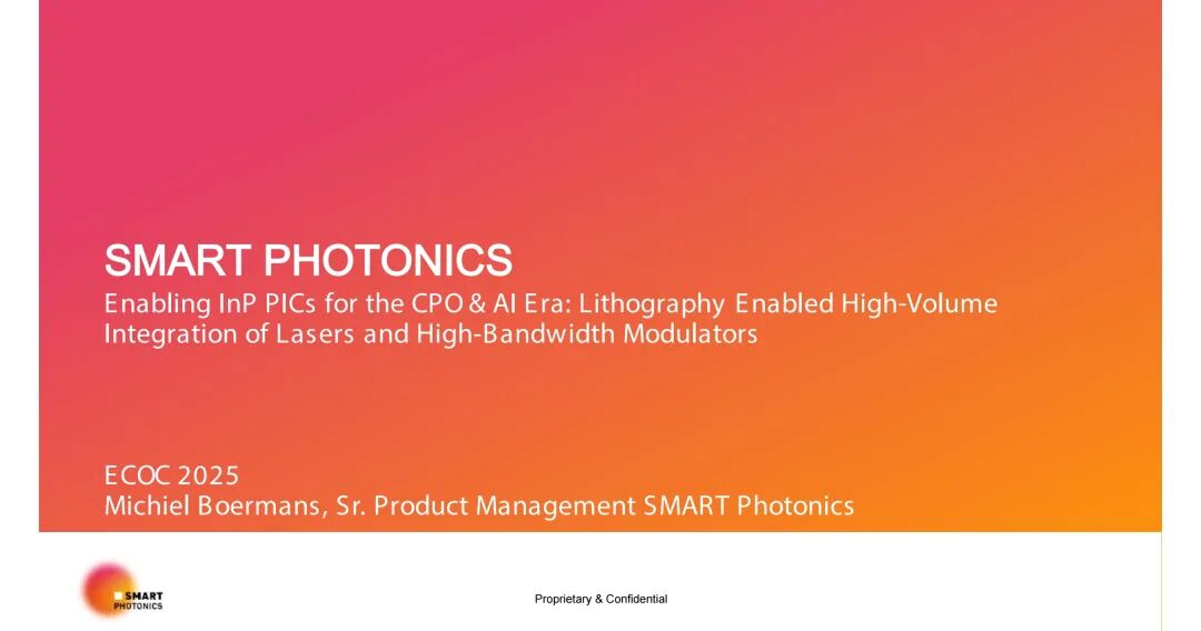 在ECOC 2025大会上,SMART Photonics高级产品经理Michiel Boermans分享了题为“Enabling InP PICs for the CPO & AI Era: Lithography Enabled High-Volume Integration of Lasers and High-Bandwidth Modulators”的核心技术成果,系统阐述了磷化铟(InP)光子集成电路(PIC)在相干检测(CPO)与AI数据中心场景下的技术突破、核心优势及规模化应用前景。