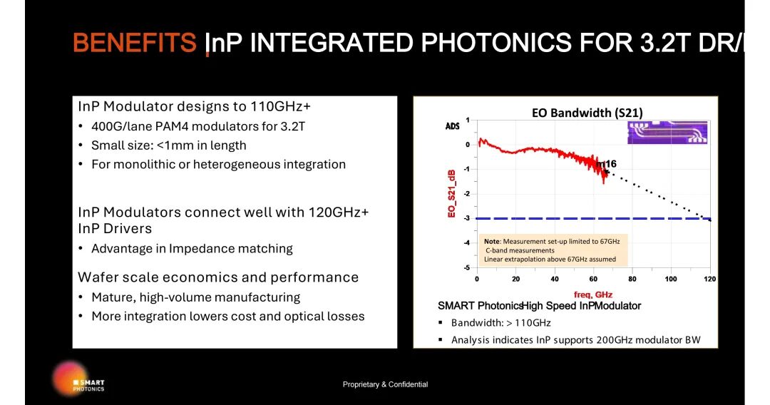 更关键的是,InP调制器已具备支撑3.2T DR/FR传输的潜力:当前设计带宽已突破110GHz,线性外推分析显示其带宽可达到200GHz,远超硅光子调制器的性能上限。该类调制器长度不足1mm,支持单片或异质集成,与120GHz以上的InP驱动芯片兼容性优异,在阻抗匹配上具备天然优势,同时依托成熟的高容量制造工艺,实现晶圆级的成本控制与性能一致性。