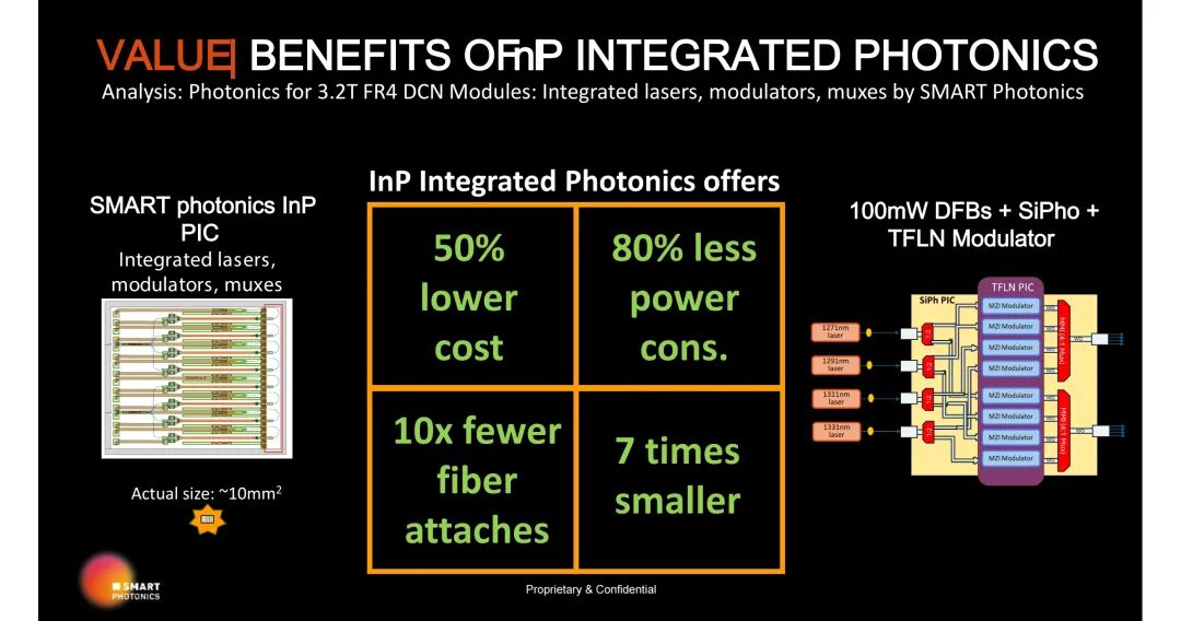 对比传统方案,InP集成光子方案优势显著:与TFLN PIC相比,尺寸缩小7倍;与硅光子+TFLN调制器+DFB激光器的混合方案相比,成本降低50%,功耗减少80%,光纤连接点减少10倍,全方位满足3.2T FR4 DCN模块的严苛要求。