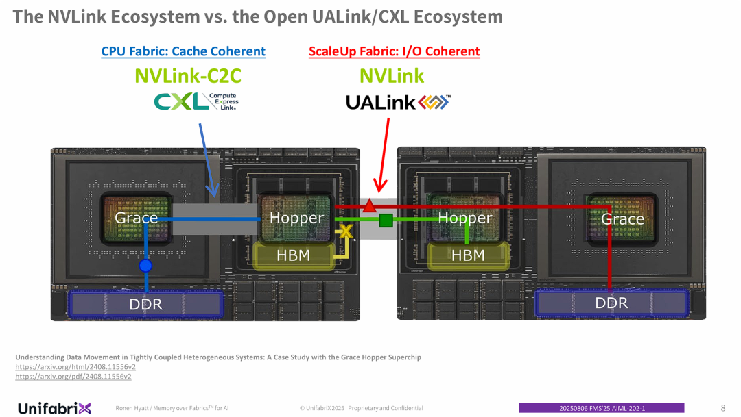 - CPU-GPU(缓存一致性): NVIDIA使用 NVLink-C2C。开放生态需要 CXL。