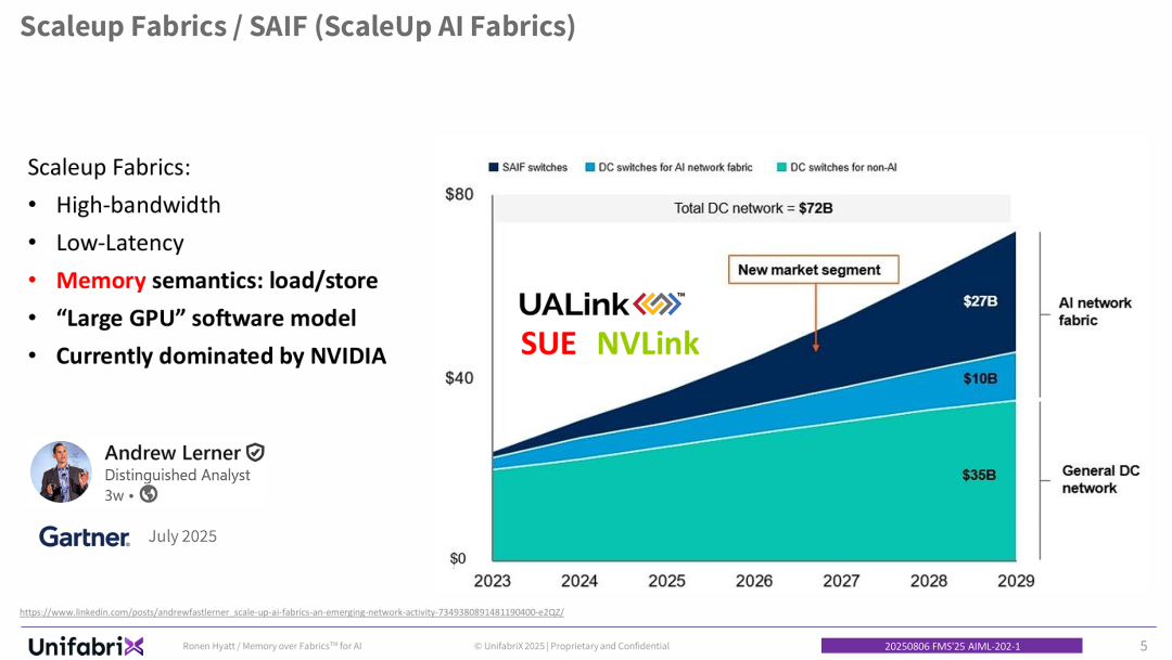 PPT的核心观点是定义“ScaleUp AI Fabric (SAIF)”是一个全新的、高价值的市场细分,它在技术上与传统的数据中心网络(即使是用于AI的Scale-Out网络)有着本质区别。