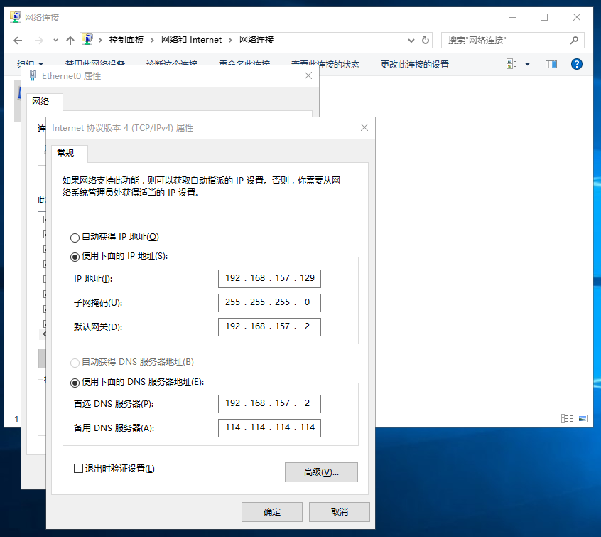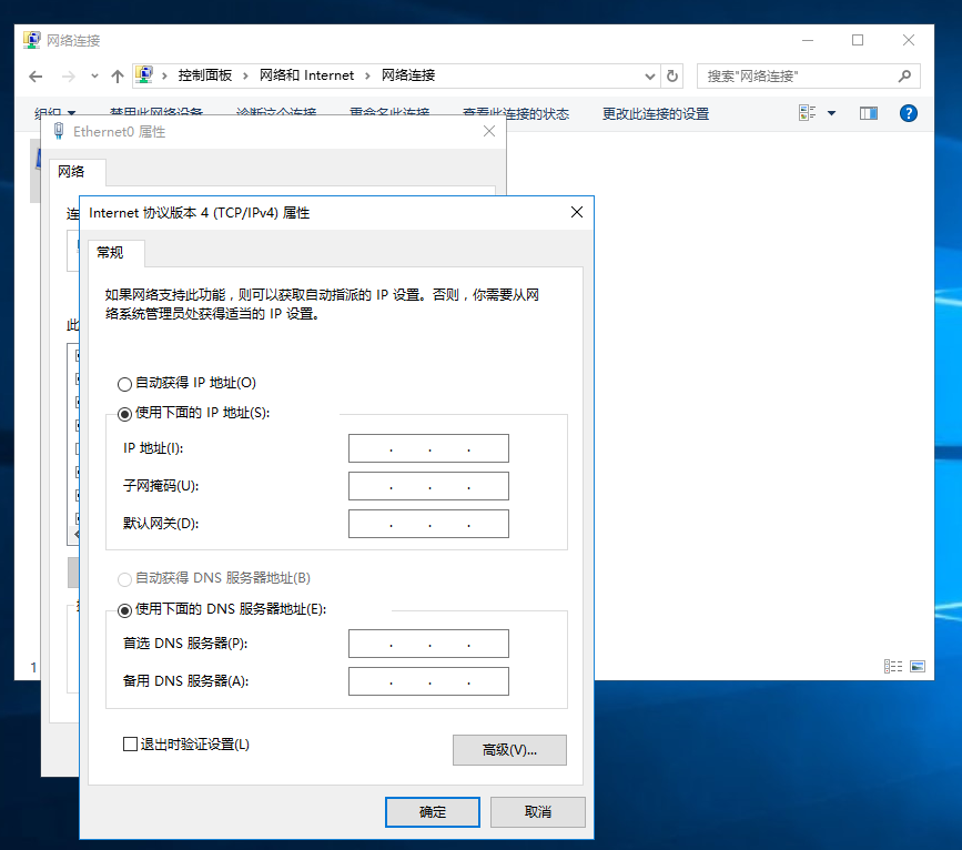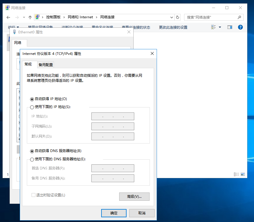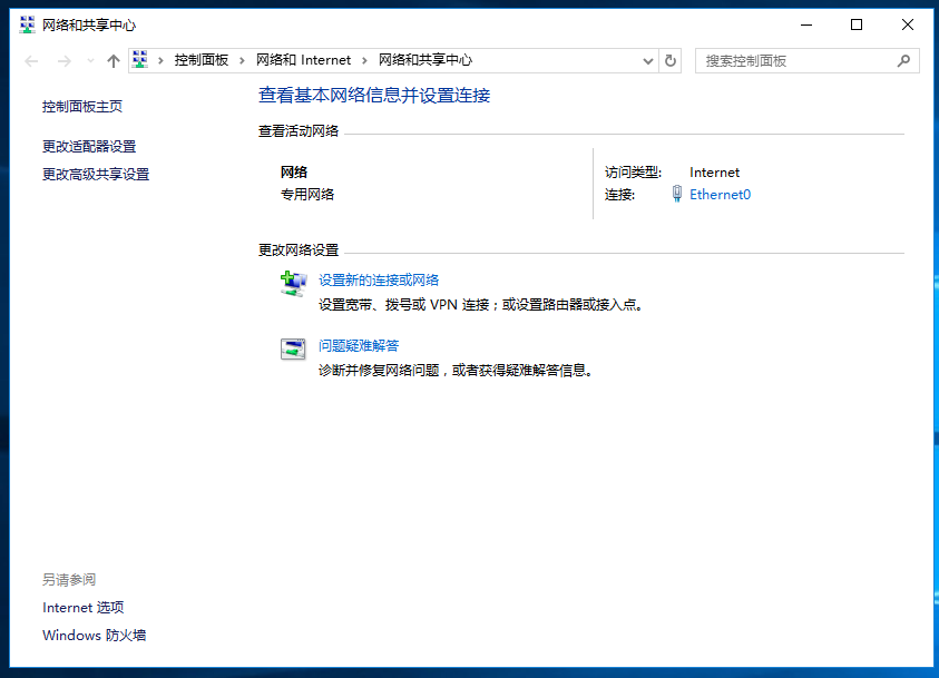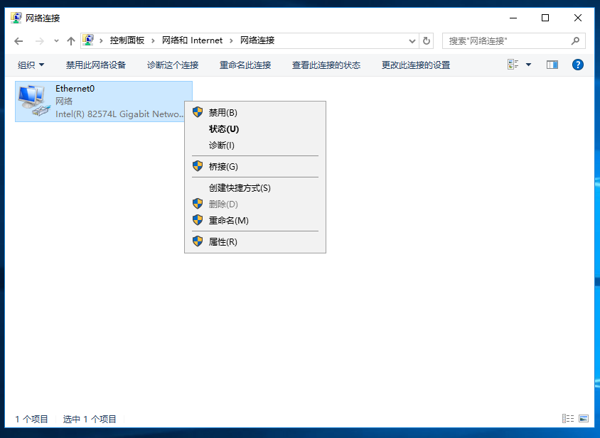 2、网络和共享中心→更改适配器设置→网络连接→Ethernet0(单击选中--或--右键单击)→(单击选中→更改此连接的设置)(右键单击→属性(R));