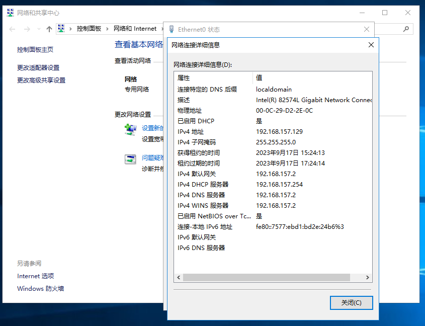 2-1、打开Ethernet0状态对话框→单击“详细信息(E)...”按钮;(--或--控制面板)