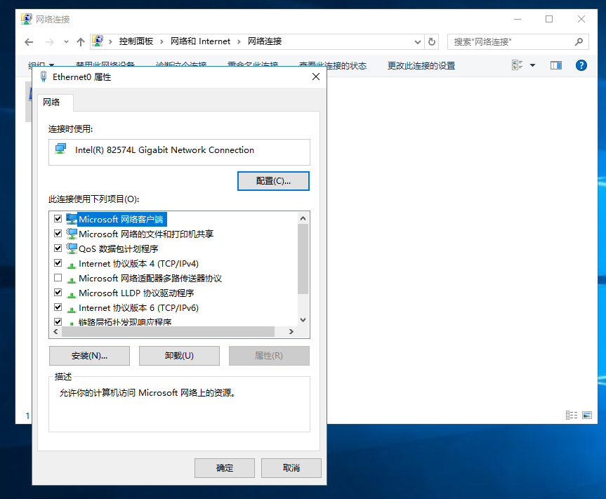 3、网络和共享中心→更改适配器设置→网络连接→Ethernet0(单击选中/右键单击)→(单击选中→更改此连接的设置)(右键单击→属性(R))→打开“Ethernet0属性”对话框;