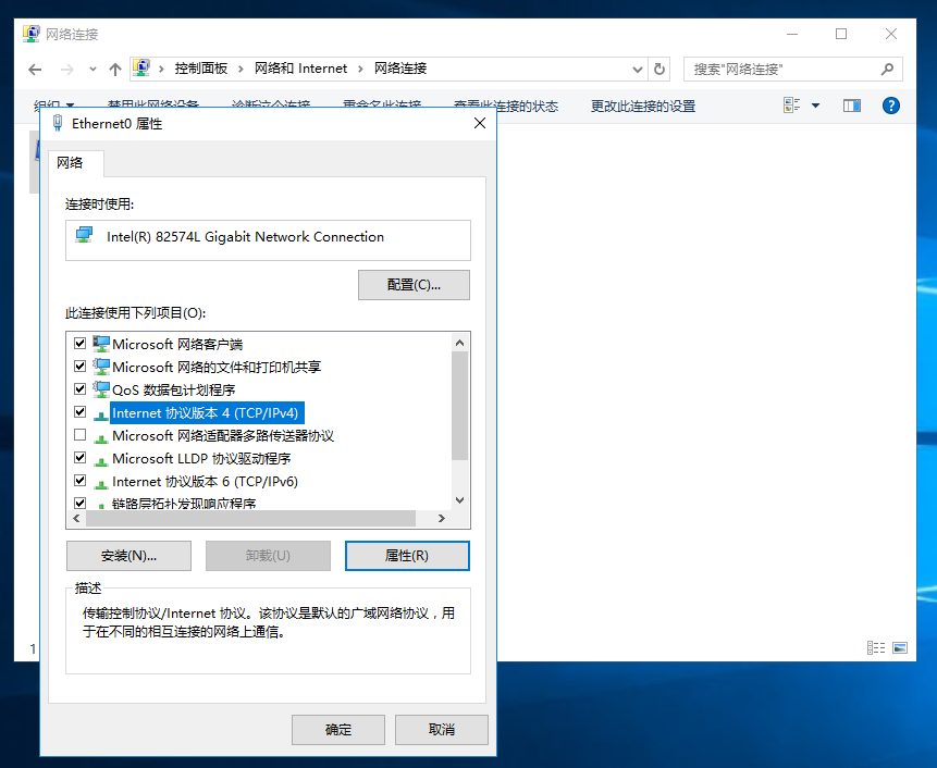 4、Ethernet0属性→选择“Internet协议版本4(TCP/IPv4)”→属性(R)--或--直接双击;