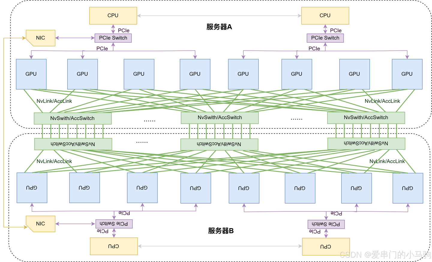 下面的图2是一个超节点么?哈哈哈,是的!服务器节点A和服务器节点B的众多GPU通过NvLink/AccLink相连,构成了NvLink/AccLink域,是多节点的NvLink/AccLink。