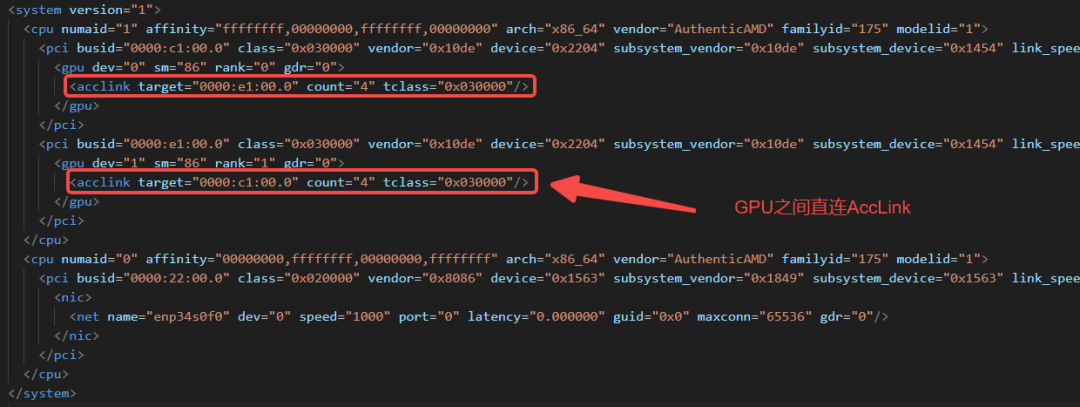 没有超节点时,每个服务器节点只需完成自生的拓扑识别,如图4所示,给出了ACCL识别出来的一台服务器拓扑文件,可以看到CPU、GPU、NIC、直连AccLink、PCIe等信息。