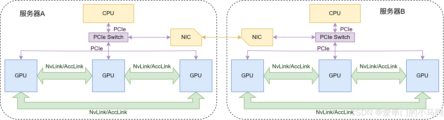 图1是一个超节点么?显然不是!服务器A是节点,服务器B是节点,但是服务器A和B之间是通过延迟较高网卡相连,不是通过高带宽低延迟的NvLink/AccLink相连,不构成一个超节点。