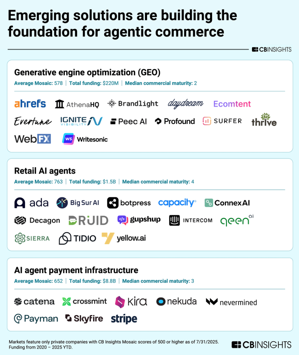 - 支付基础设施:Agent要购物,必须有钱包。Skyfire、Nekuda等初创公司正在构建“AI支付轨道”,为Agent提供数字钱包、身份认证(KYA - Know Your Agent)和消费限额功能。Visa、Mastercard等金融巨头也通过投资和合作积极布局。