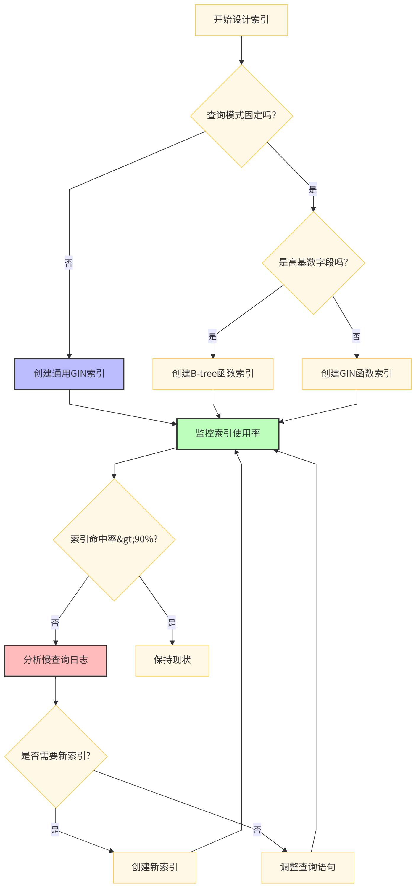 索引选择性差 | 对整个JSON文档建索引,体积巨大且效果不佳 | ⭐⭐⭐⭐ |