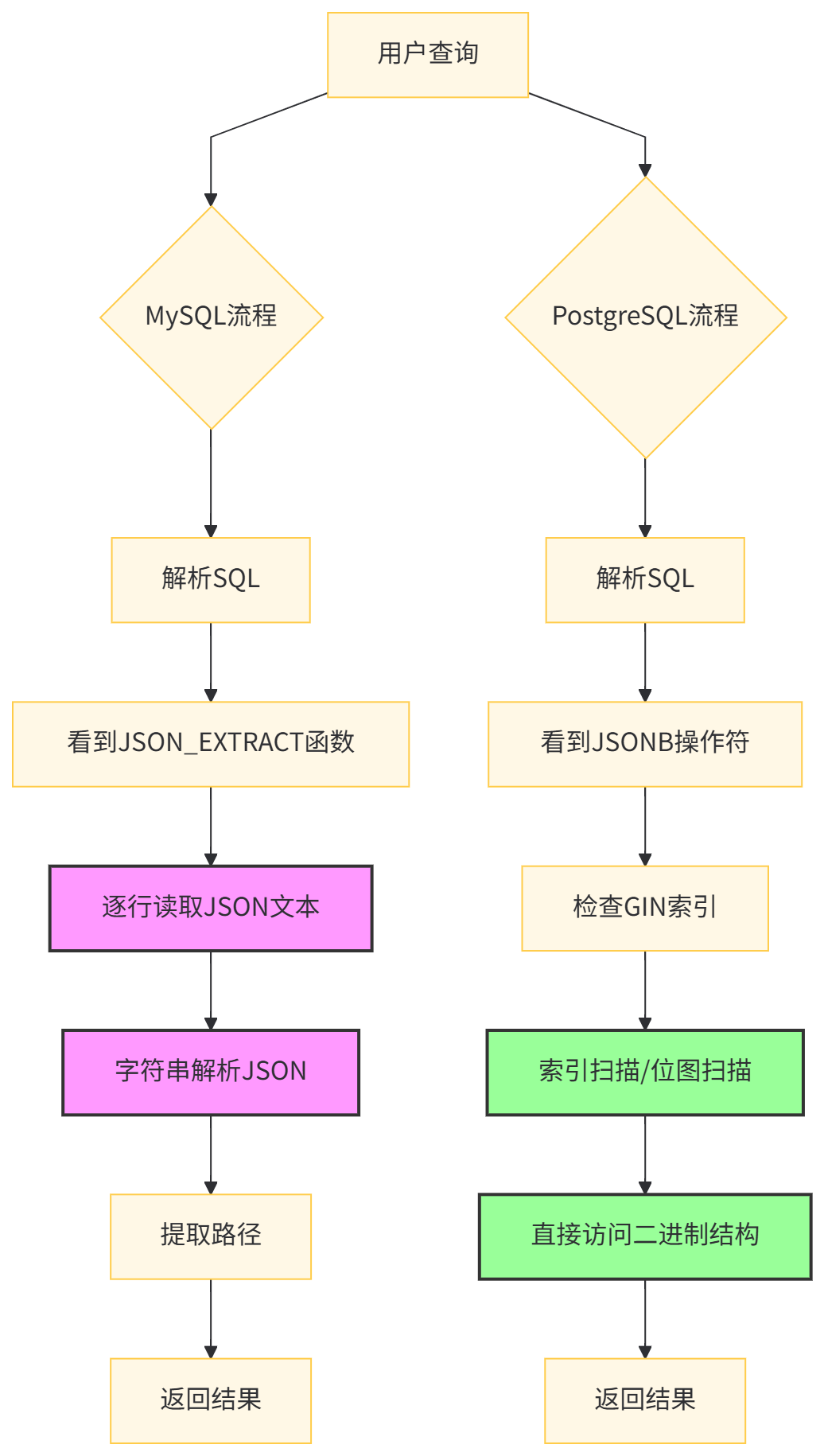 这才是关键。MySQL把JSON当字符串处理,而PostgreSQL把JSON当数据结构处理。