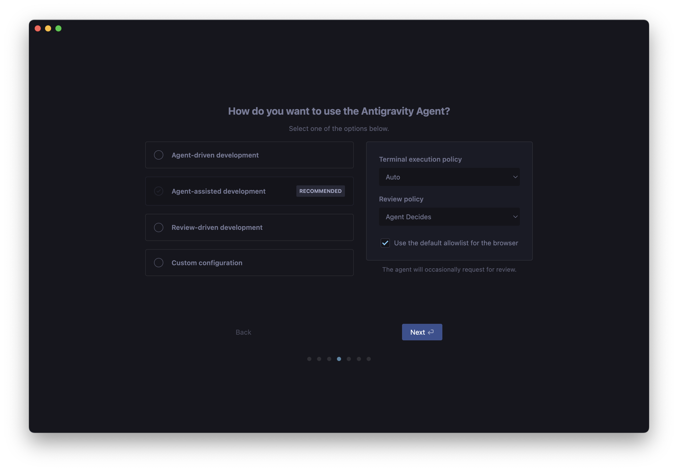 安装向导中包含关于 Agent 权限的配置页面。这是 Antigravity 与传统 IDE 最大的不同之处,请重点是右边的两个核心属性。