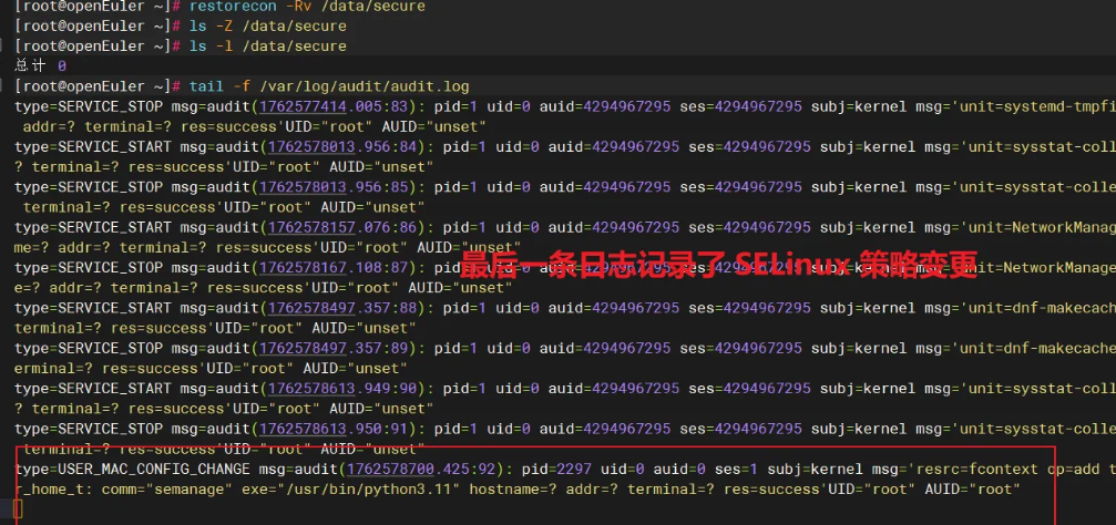 ls -Z /data/secure测试访问,查看 SELinux 日志: