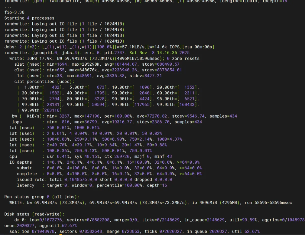 fio --name=randwrite --ioengine=libaio --iodepth=16 --rw=randwrite --bs=4k --direct=1 --size=1G --numjobs=4 --runtime=60 --group_reporting