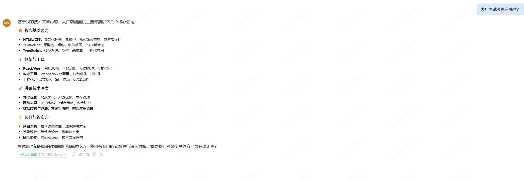 AI:基于我的技术文章内容,大厂前端面试主要考察以下几个核心领域:🔥 核心基础能力 HTML/CSS:语义化标签、盒模型、Flex/Grid布局、响应式设计...(泛泛而谈)