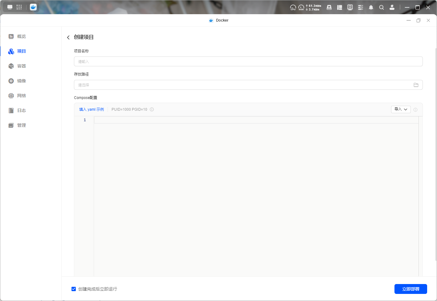 PixelPunk的部署并不难,项目涉及到了主程序、MySQL数据库、向量库以及Redis缓存,通过compose我们可以一键配置好对应的项目变量。打开绿联Docker中的项目,选择创建新项目。