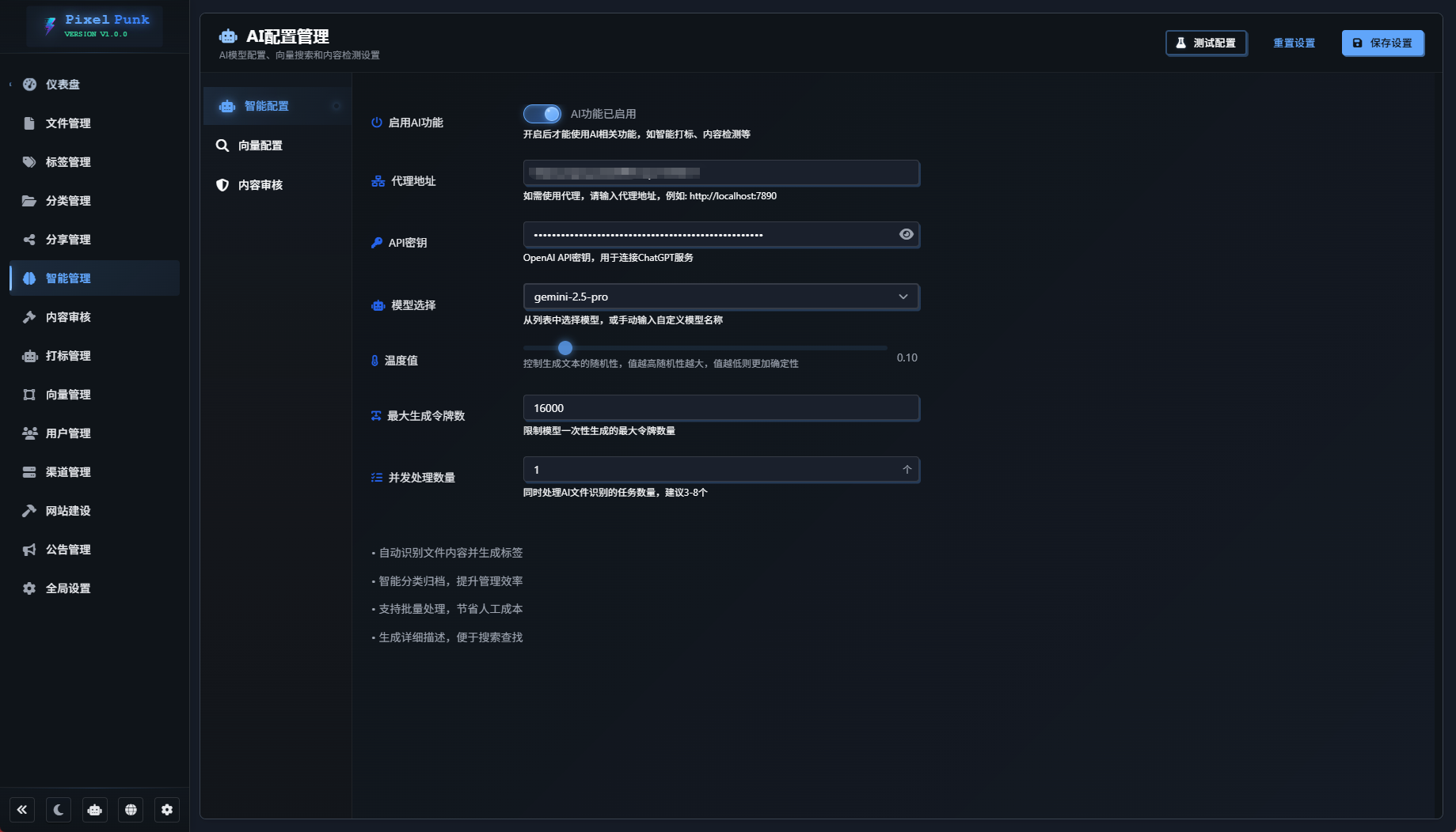 首先要使用AI进行打标、分类以及识别,我们要现在后台智能管理中去设置对应的模型以及API,其中智能配置需要用到多模态模型,而向量配置则是向量模型,这一点不能搞错了,模型支持自定义对接地址,如果是用的第三方非官方,并发数量切记不要开太高。