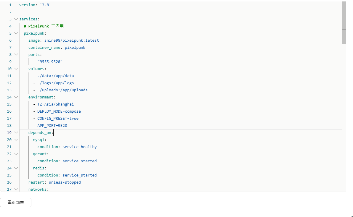复制粘贴以下代码,其中涉及到的环境变量、端口以及映射文件夹需要你根据自身的NAS环境去更改,避免端口冲突等问题。