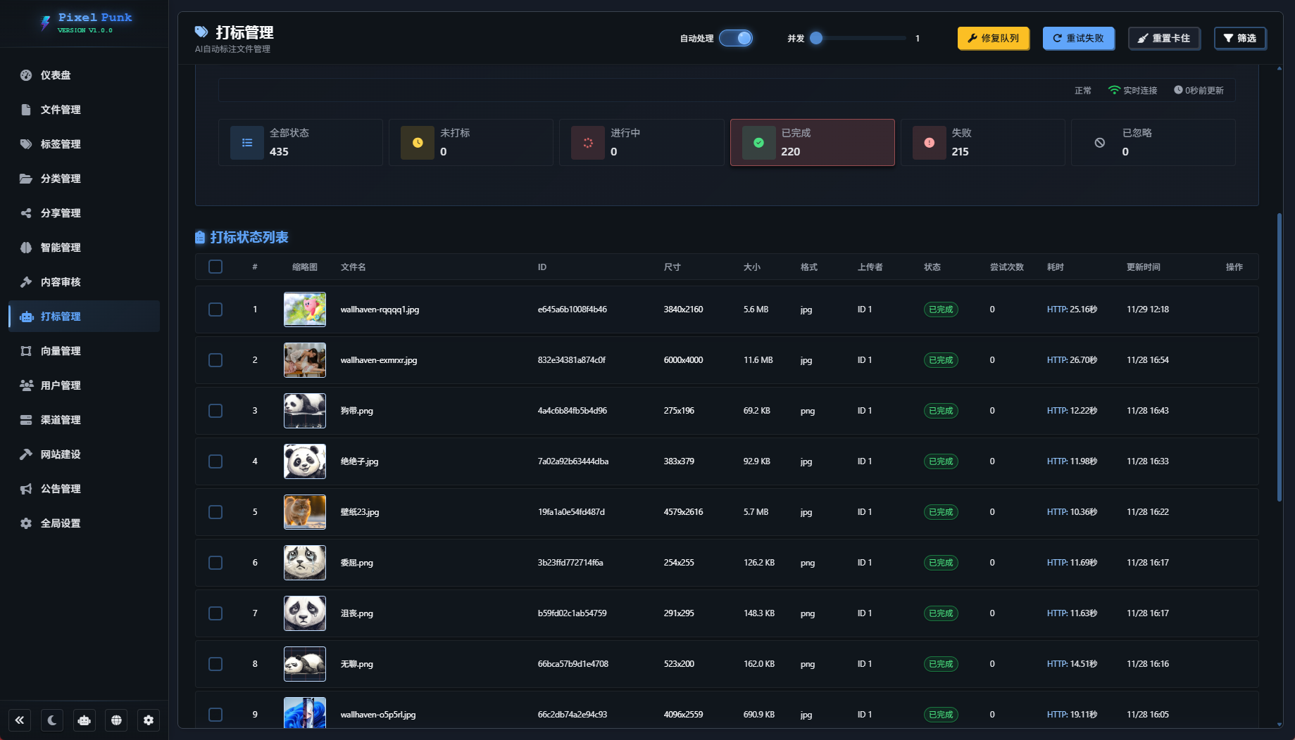 图片上传之后回到后台,点击打标管理,这时候能看到未打标、进行中、已完成以及失败和忽略几个状态,新上传的会自动进行打标处理,如果模型配置正确,会在已完成中显示。