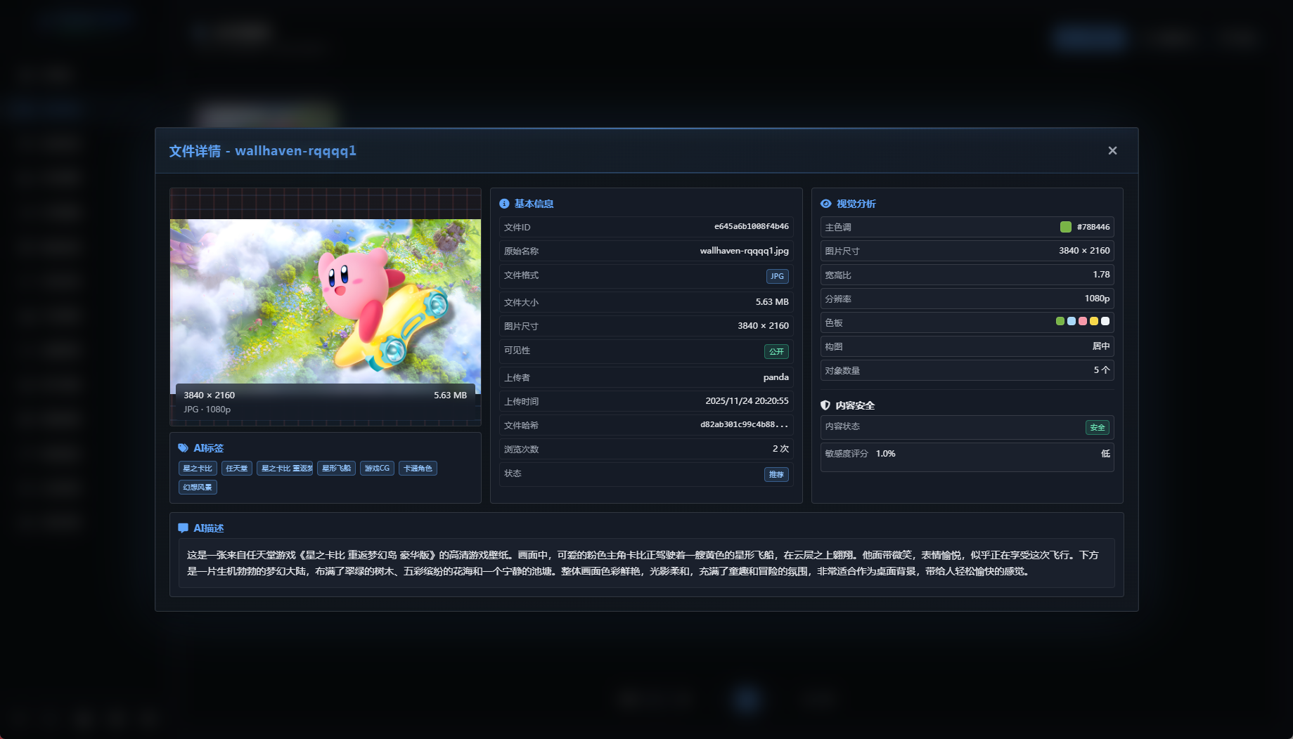 来到文件管理中,找到刚刚打标的图片,点击详情就能看到视觉分析后图片的所有信息了。信息包括AI生成的标签、描述、色调、尺寸、宽高比、分辨率以及构图和敏感度评分,识别的精准度和模型有关。