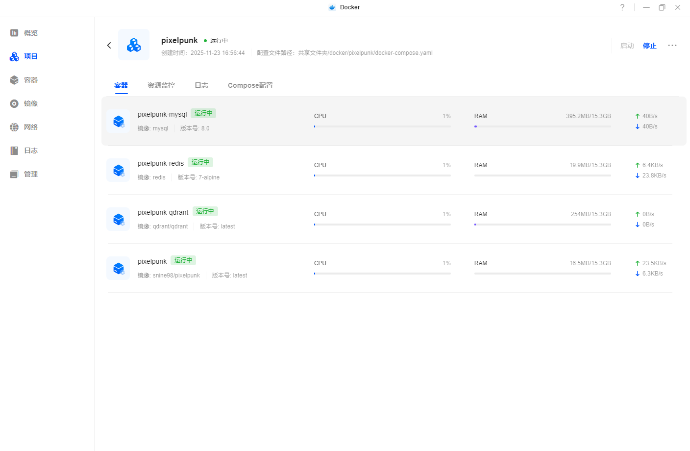 确定所有内容无误之后点击立即部署,NAS会拉取镜像并启动容器,这时候在项目管理中能看到主程序以及附属程序都已经运行成功。