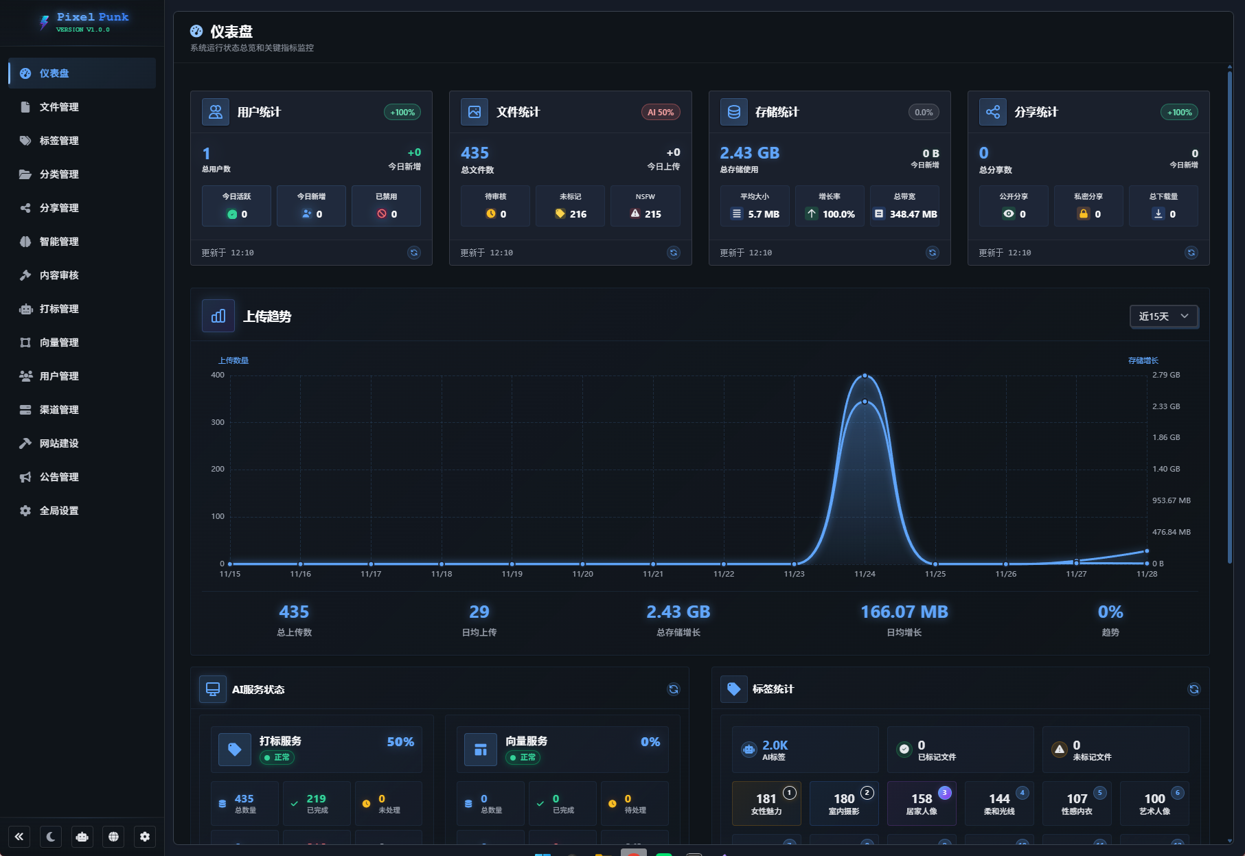 登录后台之后首先看到的是仪表盘,仪表盘会展示用户统计、文件统计、存储统计以及分享统计,同时下方会有上传趋势甚至AI服务和标签统计,能宏观看到整个项目中图片的打标进度和标签数等等。