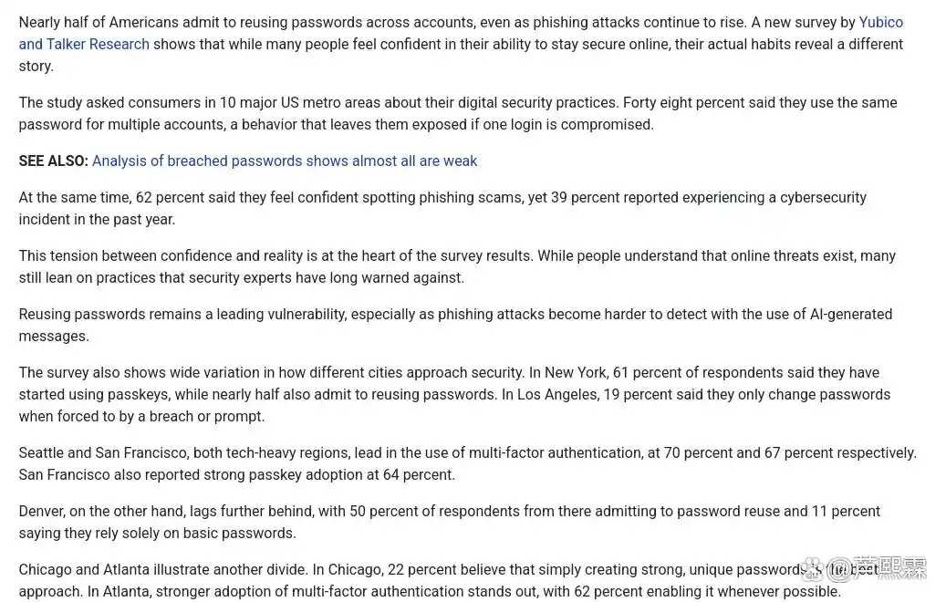尽管近年来网络安全意识显著提升,大规模数据泄露事件频发,但用户在多个在线账户间重复使用相同或仅做微小变体的密码行为仍普遍存在。本文基于2025年一项针对美国用户的实证调查,系统分析了重复密码行为的成因、技术风险及防御策略失效机制。研究指出,记忆负担、对密码管理器的误解、安全疲劳以及对多因素认证(MFA)可靠性的过度依赖是主要驱动因素。在此背景下,凭据填充(Credential Stuffing)攻击借助自动化工具与暗网泄露数据库,以极低成本实现跨平台账户接管。生成式人工智能进一步优化了鱼叉式钓鱼邮件的个性化程度,而会话令牌黑市的成熟使攻击链缩短。本文通过构建攻击模拟实验,量化重复密码对攻击成功率的放大效应,并提出从终端用户、服务提供方到监管层面的多层次缓解框架。特别强调:MFA并非万能,若底层凭证可被凭据填充结合中间人攻击(AiTM)绕过,则其防护价值将大幅削弱。最后,本文定义三项可衡量的安全改进指标:密码唯一率、无密码登录启用比例、异常登录检测平均发现时间,为后续评估提供基准。