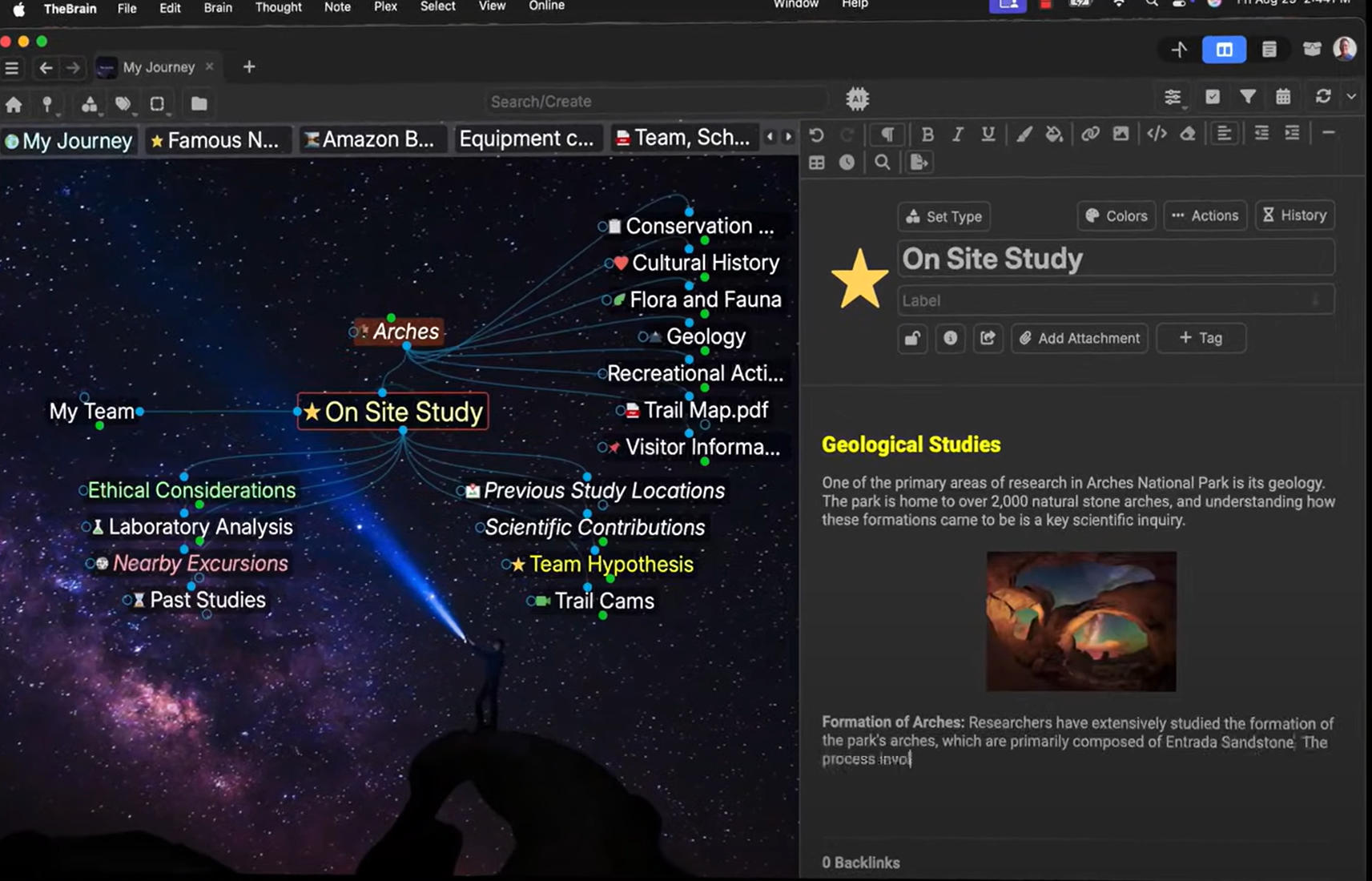 TheBrain 15在笔记编辑方面加强了Markdown的支持,提供混合的WYSIWYG+Markdown编辑体验,文本以干净的Markdown形式存储,并支持复选框、分割线与标题折叠等操作,提升书写与阅读的效率。对外部文件与文件夹链接的兼容性也更好:当外部资源作为附件被关联时,界面会以箭头覆盖图标提示其来源,便于识别与管理。思维网络操作更灵活:可通过拖拽调整节点关系,双击标题栏或编辑区可切换视图与放大窗口,交互更直观。