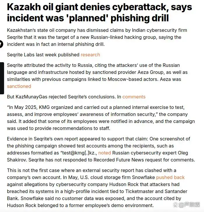此外,俄罗斯网络安全专家Oleg Shakirov指出,Seqrite公布的邮件收件人列表中包含test@kmg.kz、phish-sim@kmg.kz等明显非生产账户,此类地址绝不会出现在真实APT活动中。
