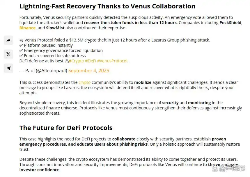 Venus Protocol事件是一次社会工程攻击与多边协同防御的典型案例。它揭示了DeFi安全的新常态:最大威胁不在代码,而在人机交互界面;最大希望不在单点防护,而在生态协同响应。通过优化授权模型、引入延迟机制、强化前端提示与建立情报共享网络,DeFi可在保持开放性的同时,显著提升抗钓鱼能力。本案例不仅验证了链上资产追索的技术可行性,也为构建更具韧性的去中心化金融基础设施提供了实践路径。未来工作可进一步探索AI驱动的钓鱼检测、标准化撤销接口及跨链统一风控协议,以应对日益复杂的威胁环境。