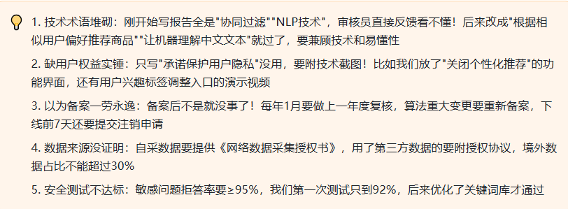 3. 审核阶段(1-2个月):初审看材料齐不齐,复审是技术专家评审,可能会要求补充测试数据(我们当时被要求提供300条敏感问题测试记录)
