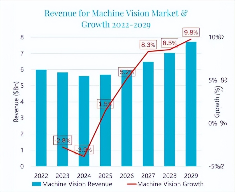 市场研究公司Interact Analysis 在其最新报告中预测:全球机器视觉市场规模将在 2025 年增长 1.5%,2026 年增长 5.2%。该机构对 2020 年代后半段的增长预期更为乐观。如下图所示。