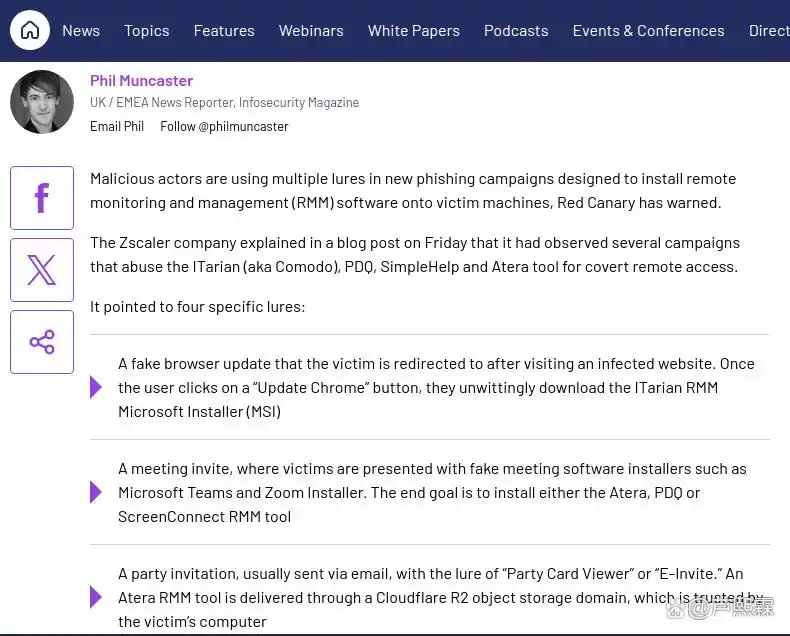远程监控与管理(RMM)平台作为现代IT基础设施运维的核心组件,广泛用于远程故障排除、软件分发与系统维护。主流RMM解决方案如Atera、PDQ Deploy、ITarian(Comodo One RMM)及SimpleHelp均提供合法数字签名的安装程序,并常被企业授权使用。然而,这种合法性与功能性正被高级持续性威胁(APT)及勒索软件组织所利用。2025年9月,网络安全公司Red Canary披露多起新型钓鱼活动,攻击者不再投递传统恶意载荷(如Cobalt Strike Beacon或定制后门),而是转而分发上述合法RMM工具的安装包,通过社会工程手段诱使终端用户主动完成安装并授予权限。