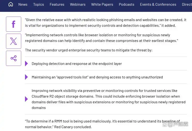 本研究揭示了一个重要趋势:攻击者正从“投递恶意软件”转向“滥用合法工具”。这要求安全防御从“识别坏东西”转向“验证好东西是否被正确使用”。RMM工具因其功能强大、签名合法、通信加密,成为理想载体。未来,类似手法可能扩展至合法协作工具(如Slack、Teams插件)、开发工具(如VS Code扩展)甚至云CLI工具(如AWS CLI)。