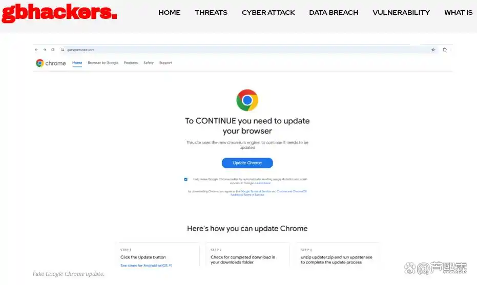 伪造浏览器更新:用户访问体育或医疗类网站时,被重定向至全屏iframe覆盖层,显示“Chrome需要立即更新”提示。页面内嵌JavaScript执行浏览器指纹采集(User-Agent、屏幕分辨率)、语言设置解析(用于地理定位),并将交互日志发送至panelswp[.]com等C2域名。