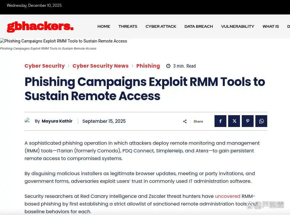 关键词:RMM工具;隐蔽远程控制;钓鱼攻击;持久化;EDR检测;网络微隔离