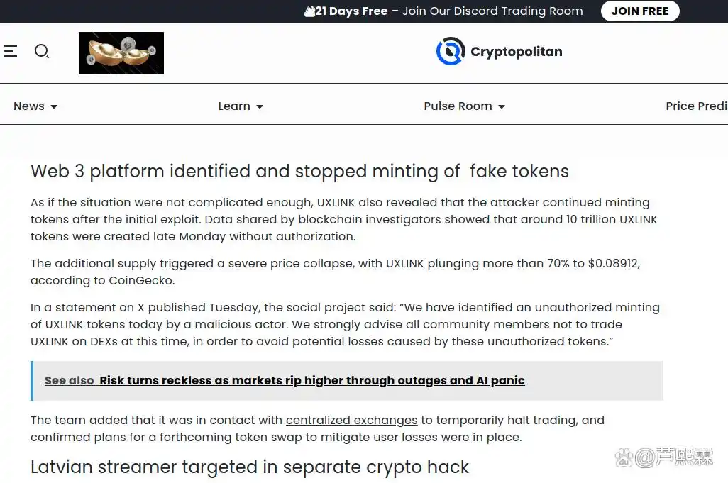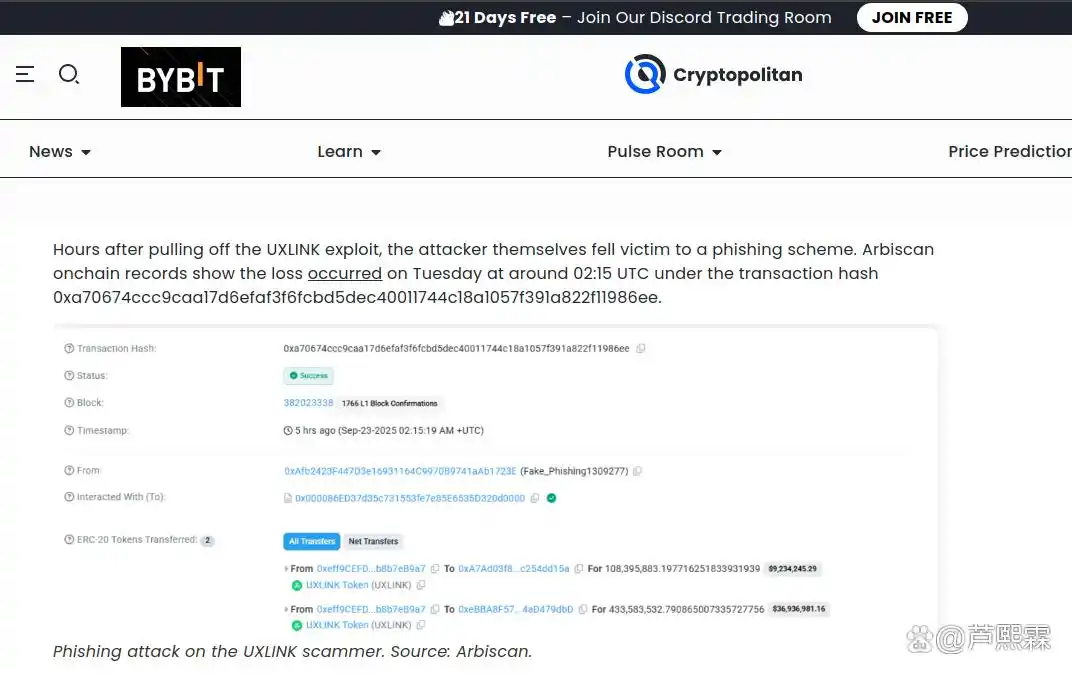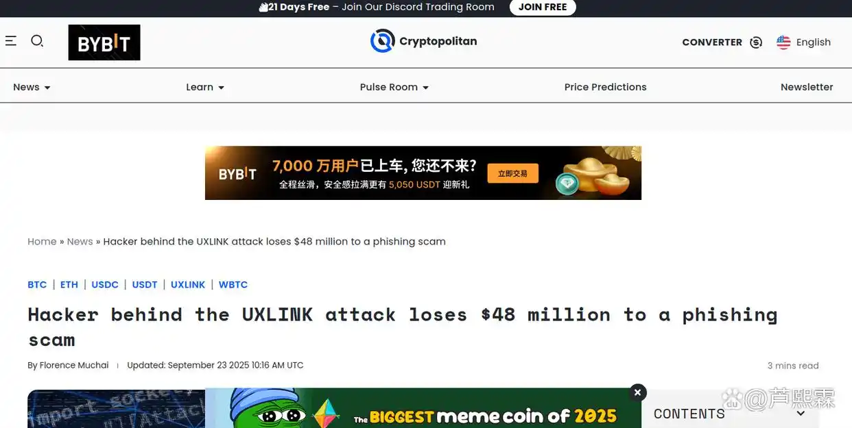 去中心化金融(DeFi)与Web3应用的快速发展催生了复杂的攻击面,其中智能合约漏洞、重入攻击、预言机操纵等技术性威胁已得到广泛研究。然而,一个常被忽略的事实是:攻击者本身也是人类,其行为同样受认知局限、信任偏见与操作惯性影响。2025年6月,加密安全媒体Cryptopolitan报道了一起极具讽刺意味的事件:一名此前通过漏洞利用从UXLINK协议窃取大量资产的黑客,在试图“洗白”或“谈判归还”部分资金时,落入精心设计的钓鱼陷阱,反被转移走价值4800万美元的ETH、USDC及治理代币。