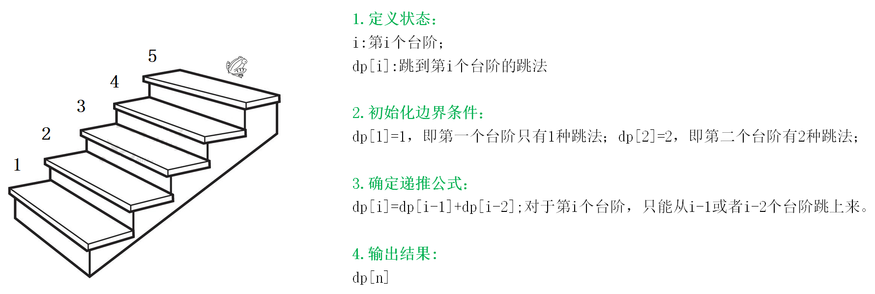 //2.初始化边界条件: dp[1]=1,即第一个台阶只有1种跳法;dp[2]=2,即第二个台阶有2种跳法;