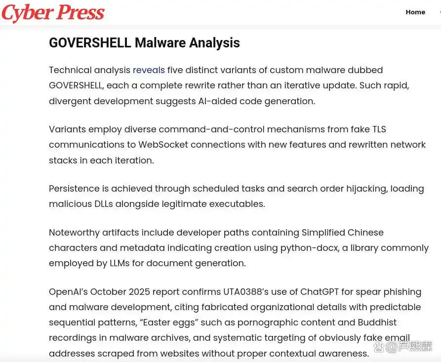 此外,在“执行”(Execution)阶段,LLM可辅助生成初始载荷。虽然复杂后门(如GOVERSHELL)仍需专业逆向与调试能力,但简单的信息收集脚本、下载器或宏病毒初稿已可由AI自动生成,大幅缩短攻击准备周期。