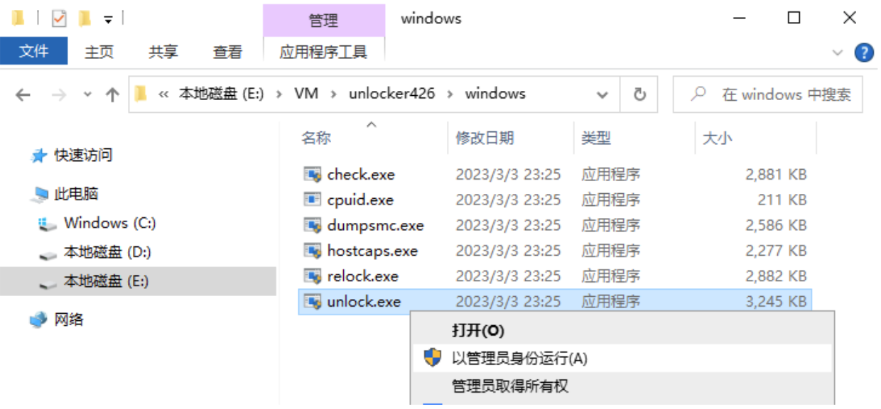 3、在的windows目录,以管理员身份方式运行(A) unlock.exe 应用程序;