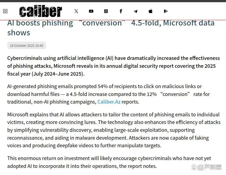 网络钓鱼作为最持久且高效的初始入侵手段,其技术演进始终紧随通信媒介与用户认知习惯的变化。2024至2025年间,人工智能——特别是大语言模型(Large Language Models, LLMs)——的普及为攻击者提供了前所未有的自动化与个性化能力。微软在其覆盖2024年7月至2025年6月的年度数字安全报告中披露,AI生成的钓鱼邮件成功诱导54%的收件人点击恶意链接或下载附件,相较传统钓鱼12%的“转化率”提升达4.5倍。这一数据不仅揭示了攻击效能的质变,更预示着网络钓鱼正从“广撒网”向“精准诱捕”转型。