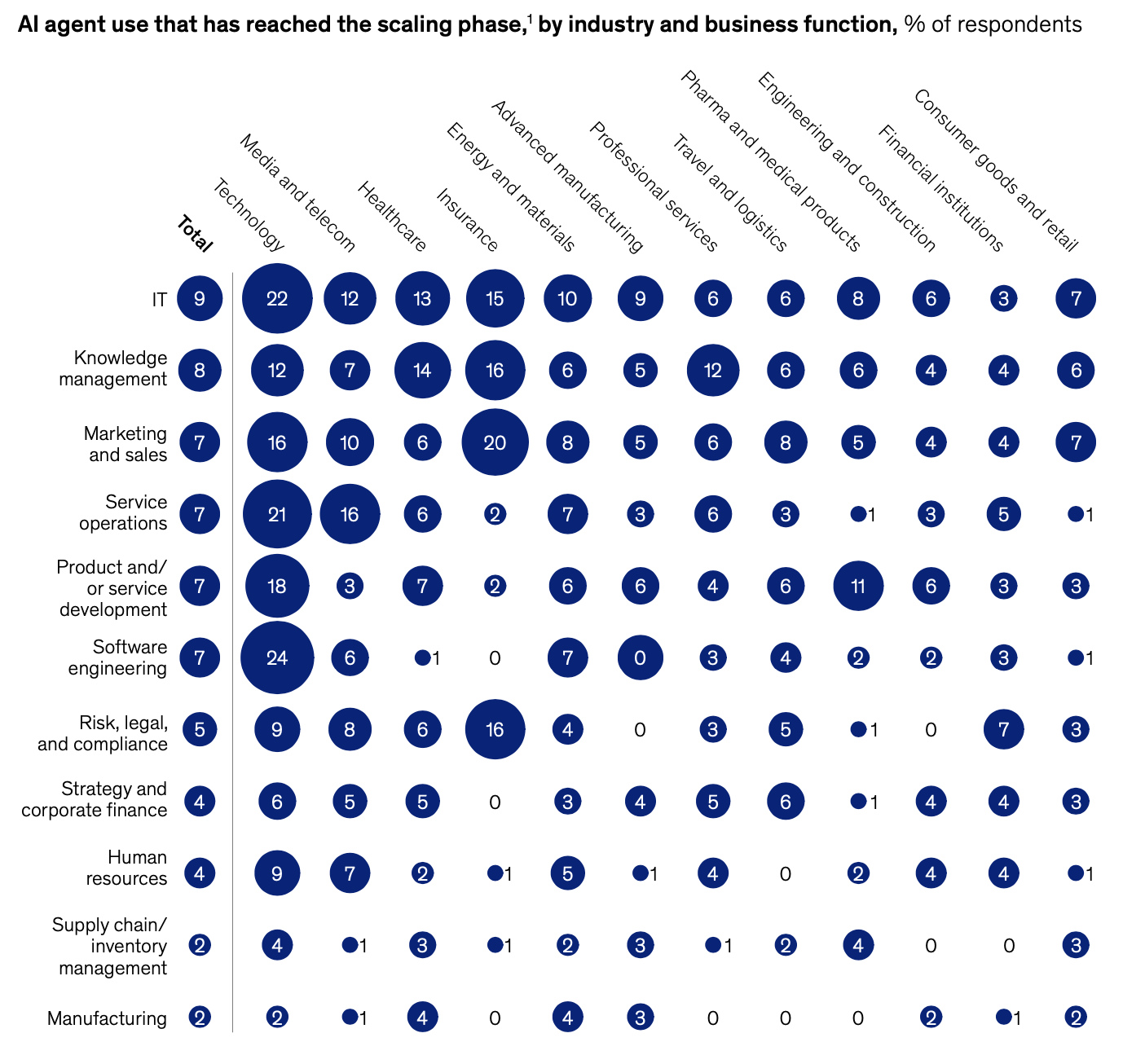 数据向我们要展示了一个看似矛盾的现象。一方面,人工智能的普及率达到了前所未有的高度,近九成的受访组织表示他们正在至少一个业务职能中经常性地使用人工智能技术。这表明,AI已经不再是实验室里的玩具,而是成为了现代商业基础设施的一部分。然而,在另一方面,绝大多数企业仍然被困在"试点炼狱"之中。只有极少数的企业成功地将人工智能项目从概念验证阶段推向了大规模落地,进而产生了实质性的息税前利润影响。