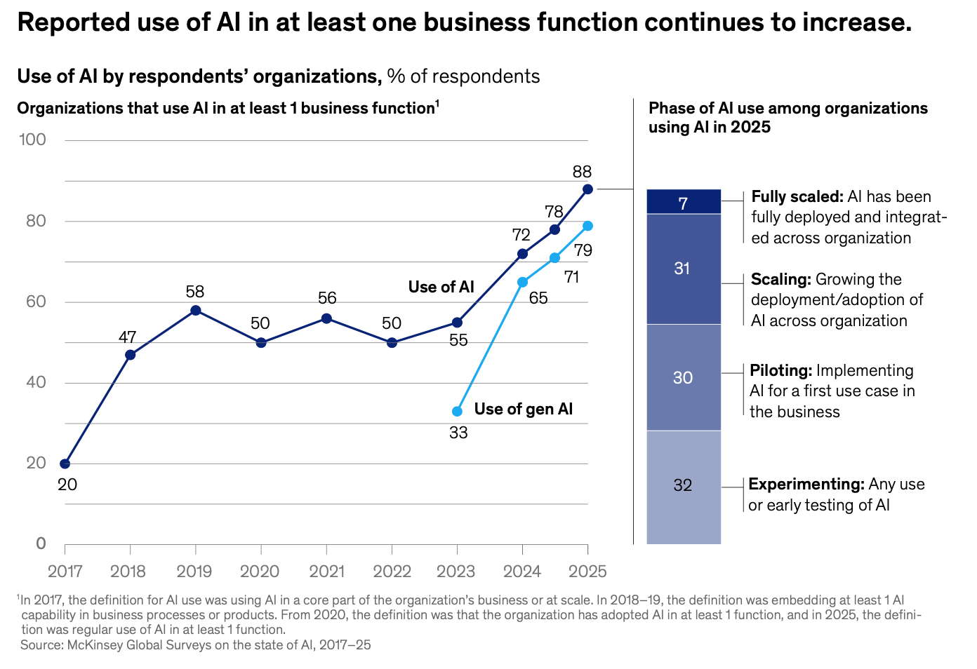 2025年标志着人工智能发展史上的一个重要分水岭。回顾过去三年,生成式人工智能从最初的惊艳亮相,迅速演变为企业技术栈中的常客。然而,根据麦肯锡最新的全球调研数据(麦肯锡的报告《The state of AI in 2025》全文可以从“走向未来”知识星球中获取),我们看到的并非是一幅全线告捷的胜利图景,而是一个充满张力、分化严重的现实世界。绝大多数组织已经跨过了认知的门槛,开始在某些业务职能中常态化使用人工智能,但真正能够实现规模化部署并从中获取企业级价值的先行者依然寥寥无几。这种从"实验"到"转型"的跨越,正成为决定企业未来竞争力的核心命题。本文将深入剖析当前人工智能的发展现状,探讨智能体这一新兴形态的崛起,解构高绩效企业的成功基因,并对未来的技术演进与市场格局提出前瞻性的洞察。