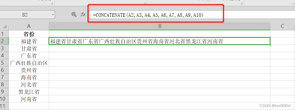 公式=CONCATENATE(A1,A2,A3....),该公式需要手动选择需合并的单元格,如果需要在每个省份后面加个分号,则需提前在A列文本后先加分号,再使用公式