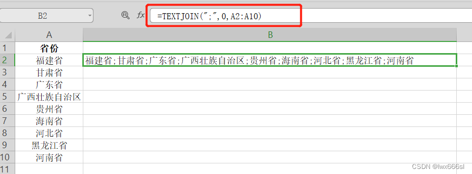 =TEXTJOIN("分隔符号",0或1,区域),如下=TEXTJOIN(";",0,A2:A10),其中0表示忽略空白单元格,";"表示省份时间连接时用分号隔开